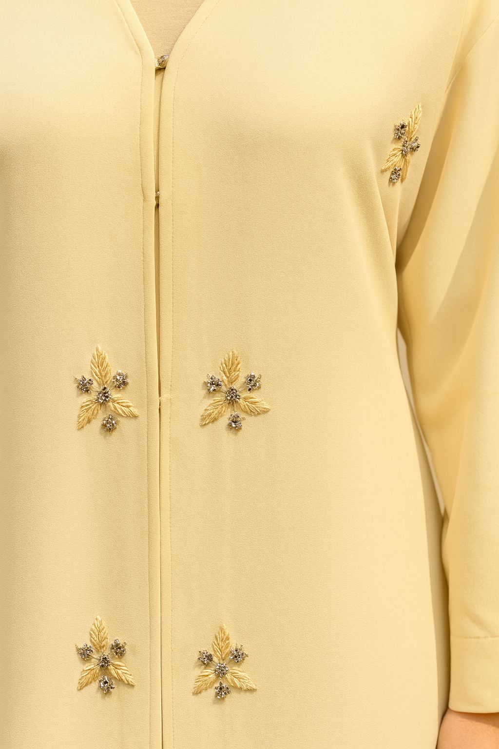 Amarielle is a yellow abaya designed for everyday elegance. With delicate leaf embroidery, crystal accents, it comes with a matching scarf for a polished finish. Perfect for uni or work, its wrinkle-resistant fabric keeps you looking graceful and put-together all day.
