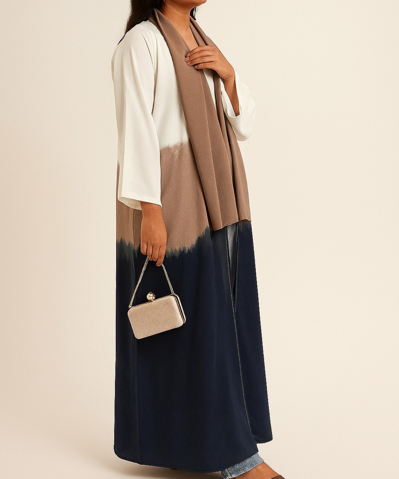 This chiffon abaya is perfect for hot days. It features a stunning gradient from white to brown to blue, combining style with comfort.