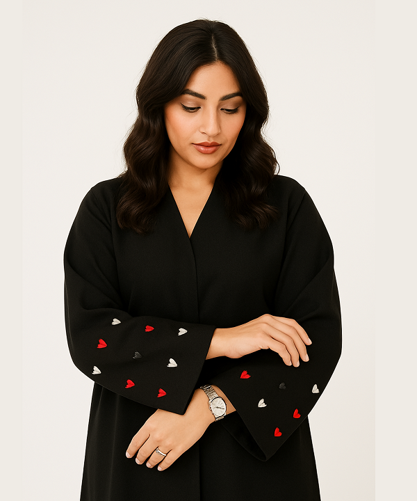 Abaya with Red, White, and Grey Hearts is a stylish homage to Minnie Mouse, featuring a classic black backdrop adorned with red, white, and grey hearts at the end of the sleeves. This delightful design incorporates Minnie’s signature colors, combining tradition with pop culture in a charming and fashionable way.