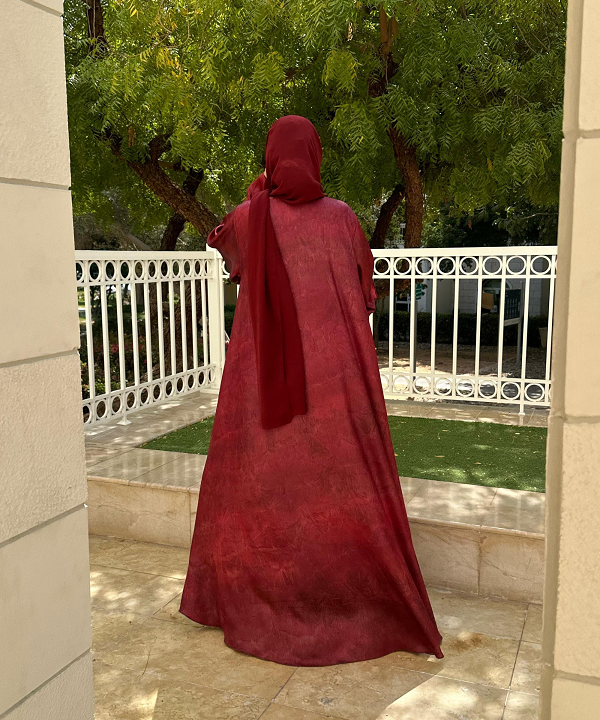 Crafted from smooth, high-quality silk, it offers a soft, flowing drape that moves beautifully with every step. The subtle sheen of the fabric adds a touch of sophistication, while the minimal design allows effortless styling. Paired with a matching maroon chiffon hijab, this abaya brings refined grace to any modest fashion collection.
