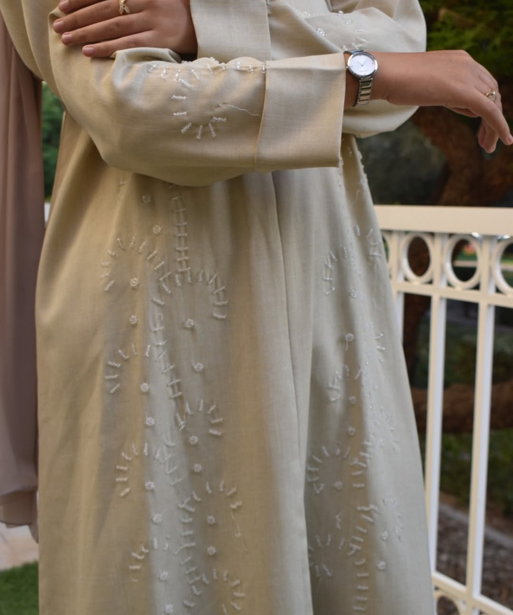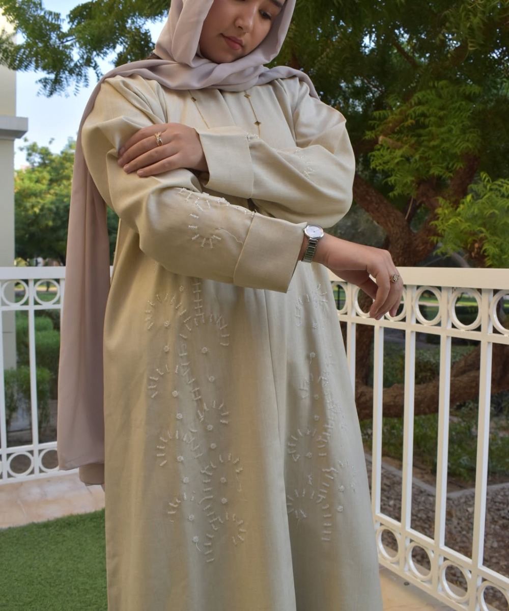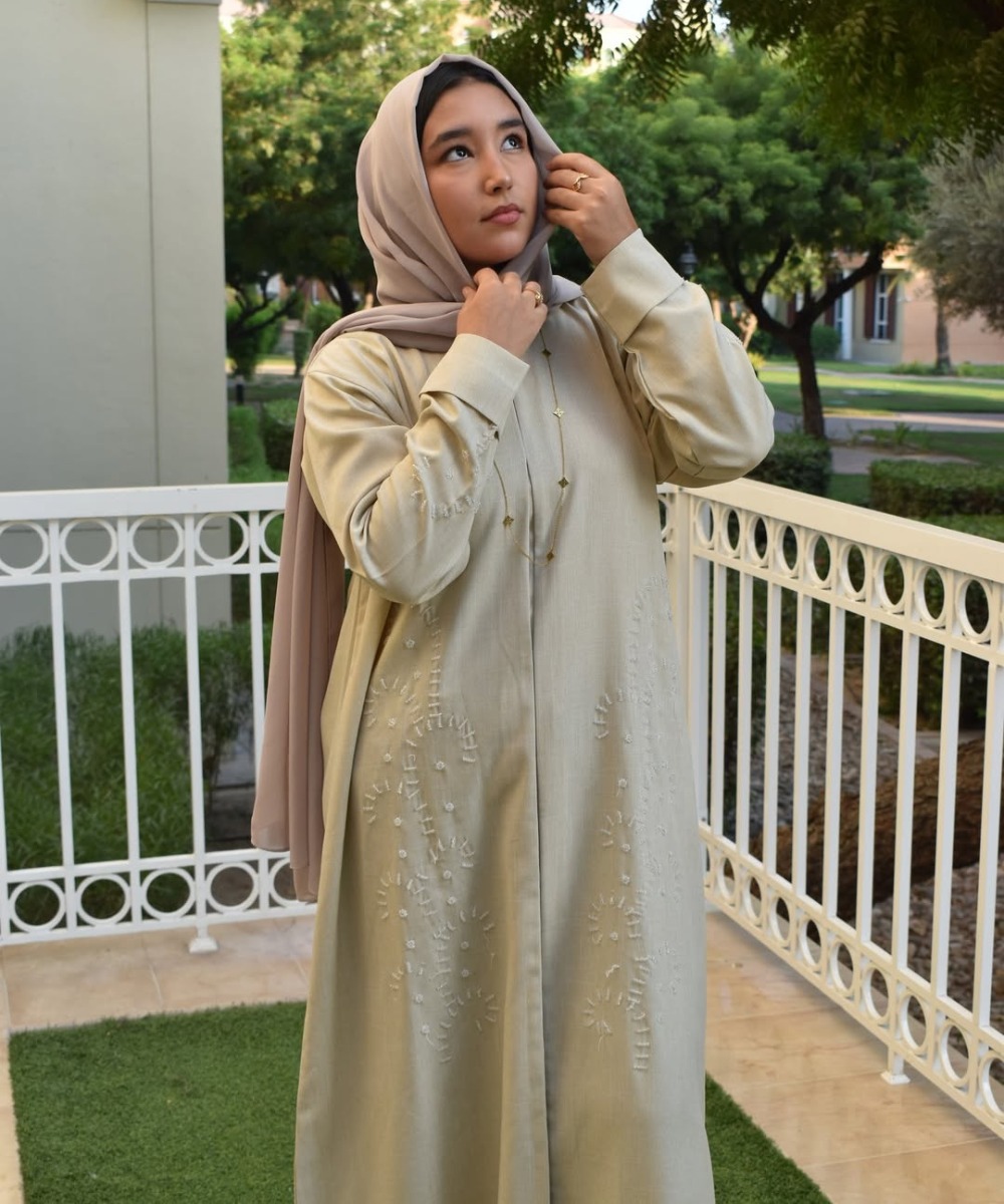 Sandlight is a soft beige abaya featuring delicate embroidery and a relaxed fit. Its neutral tone and lightweight fabric make it perfect for effortless everyday elegance. Comes with a matching scarf.