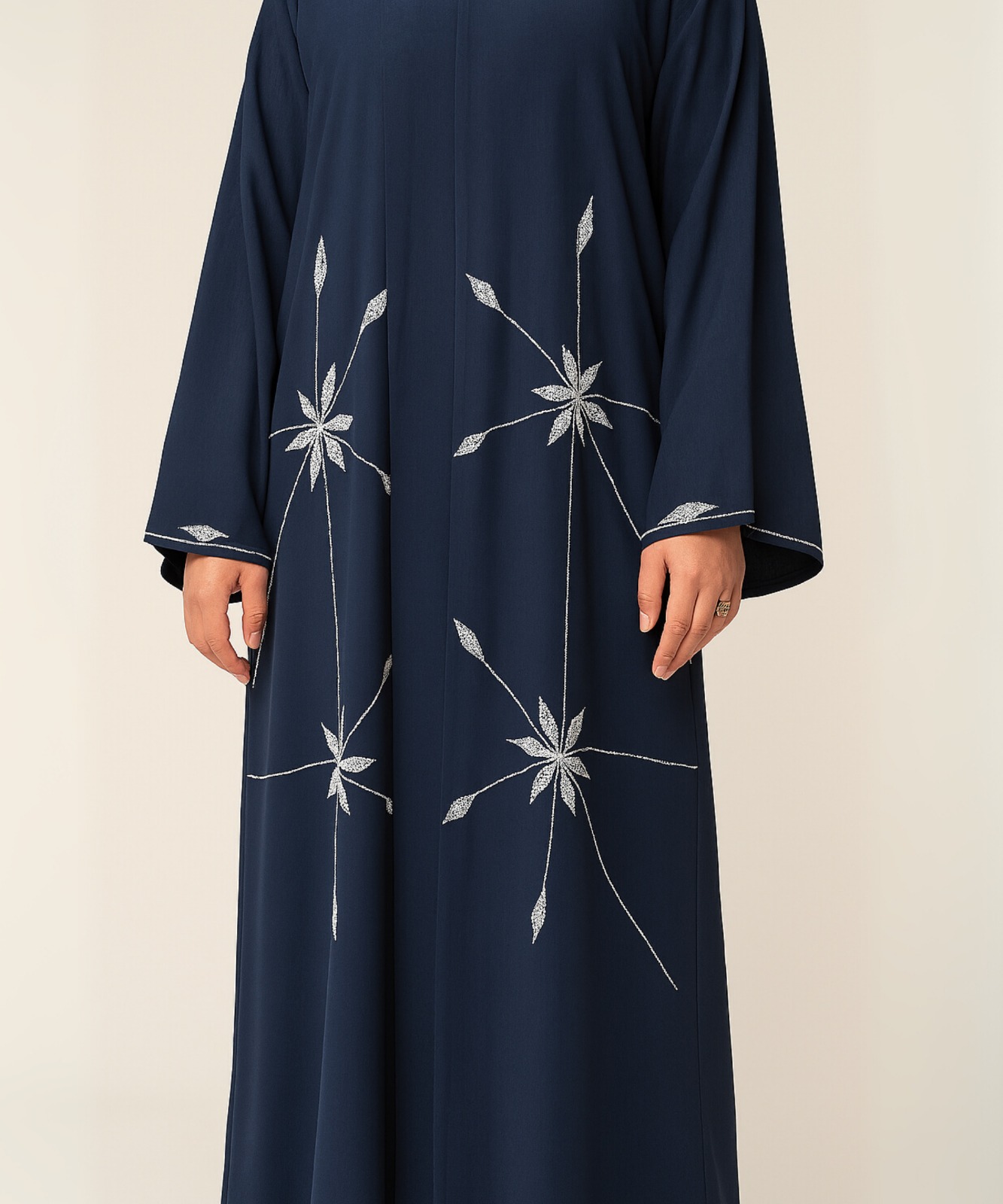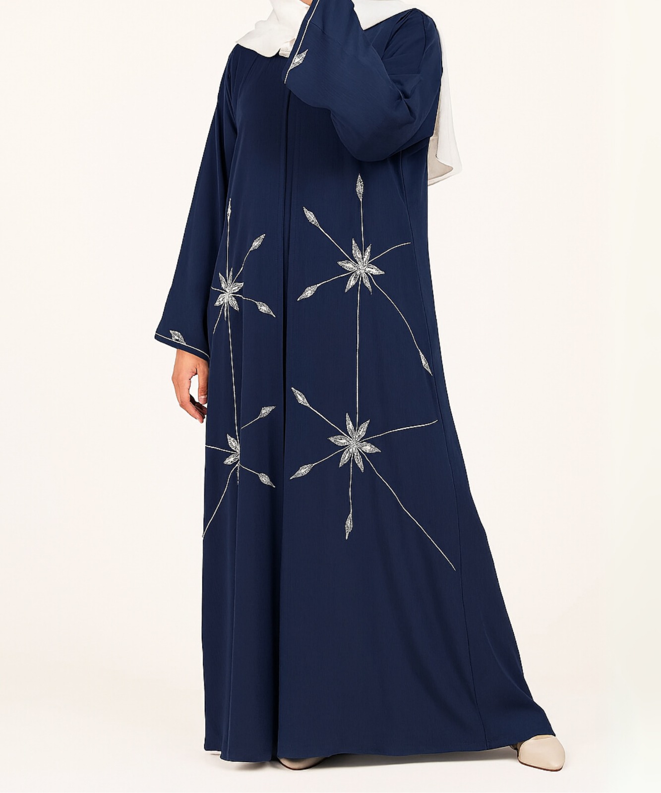 A three-piece abaya in navy blue with exquisite rhinestone embroidery. It is ideal for celebrations like Eid and Ramadan.